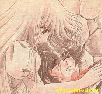 Ainda mais agora, quando sentia o calor do rosto de Seiya, ferido e exausto, como se dormisse repousando em seu peito, a dor provocada pela flecha de ouro disparada por Tremor de Sagita desaparecia, convertendo-se em uma sensação de bem-estar.